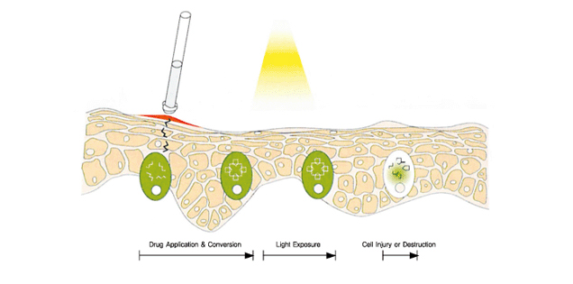 레블란(Levulan )을 병변 부위에 바르고 30~60분간 기다린 후, 광선치료기나 레이저 또는 IPL 등을 이용해 가시광선 8~15분간 조사합니다.