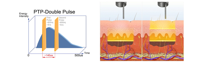 고출력의 에너지를 반으로 나누어 부드럽게 마사지하듯 연속으로 전달하여 기존의 Q-switched Nd : YAG 레이저보다 높은 에너지를 안전하고 편안하게 전달합니다.