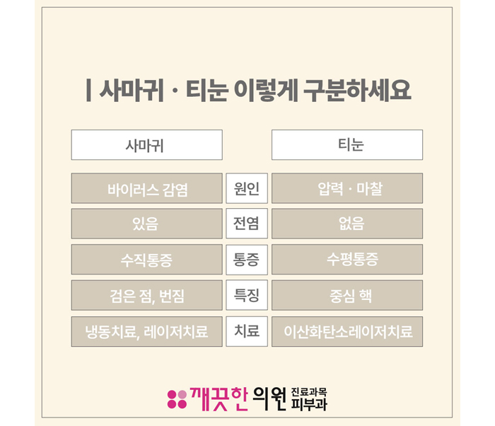 사마귀는 바이러스성 피부 질환입니다. 정확히는 인유두종바이러스(HPV)에 의해 발생합니다. 피부에 작은 상처가 있을 때 바이러스가 침투하면서 생깁니다. 특히 아이들이나 면역력이 떨어진 분들에게 잘 생기고 방치하면 점점 개수가 늘어날 수 있습니다.