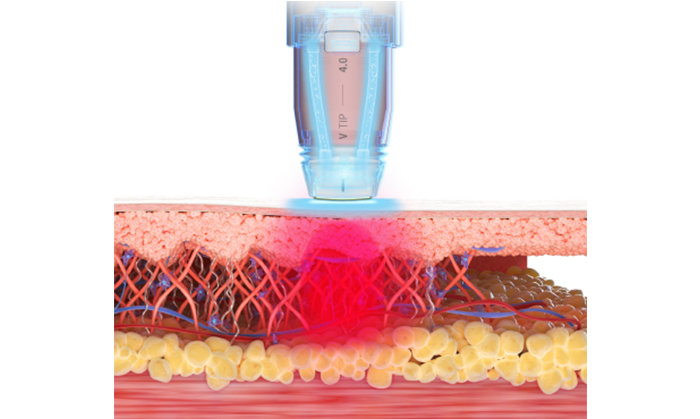 볼뉴머의 고주파 에너지가 피부에 도달하며 피부속 조직을 응고 시키며 시술 효과를 지속합니다.